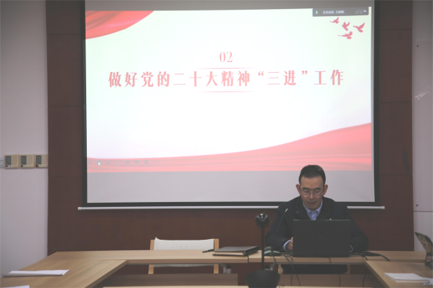 本科教学副院长韩文龙教授主持了本次研讨会,并作了主题为“全面推进课程思政建设:二十大精神三进”的专题发言。韩文龙指出:全院教师必须认真学习贯彻党的二十大精神,自觉肩负起研究阐释党的二十大精神的学术使命;必须全面推进课程思政建设,扎实推动党的二十大精神“进教材”“进课堂”“进学生头脑”;必须形成科研、教学和社会服务多方合力,不断增强思政课的思想性、理论性和亲和力、针对性,推动实现全员全程全方位育人,努力培养社会主义建设者和接班人。
