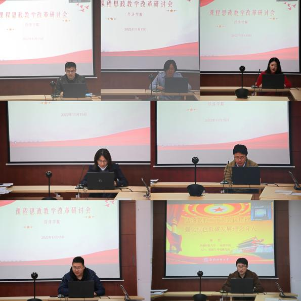 接下来各系所、课程组教师代表针对全面推进课程思政建设这一主题分别作了主题发言。政治经济学课程组组长姚常成老师结合二十大报告,通过查找数据及进行学理化思考,多角度阐释如何将新时代中国经济发展的成就融入《政治经济学》教学过程中。宏观经济学课程组组长陈晓玲副教授从人才培养、课程组建设两方面对课程思政建设的具体做法及未来展望进行了分享。经济历史与文化研究所赵劲松副教授介绍了新时代以来在教材建设方面的成果,并提出教学内容应与研究前沿结合,更好融入习近平经济思想的设想。发展经济学研究所田森老师结合发展经济学相关理论,阐述了技术进步与经济发展的相关性,提出在教学过程中应分享中国经验,强调自主创新的重要性。微观经济学课程组高云舒老师通过课程思政相关的具体教学设计,强调应强化学生学习目的,以问题为导向,搭建理论与实践间的思维桥梁。世界经济学研究所王爱伦副教授提出,教师应该肩负起责任,精读深钻党的方针政策,将思政元素融入育人全过程。人口、资源与环境经济学研究所苗壮教授作了“弘扬党的二十大会议精神,强化绿色低碳发展理念育人”的专题发言,从党的二十大精神进教材、进课堂、进学生头脑三方面阐述了具体教学设计构想。