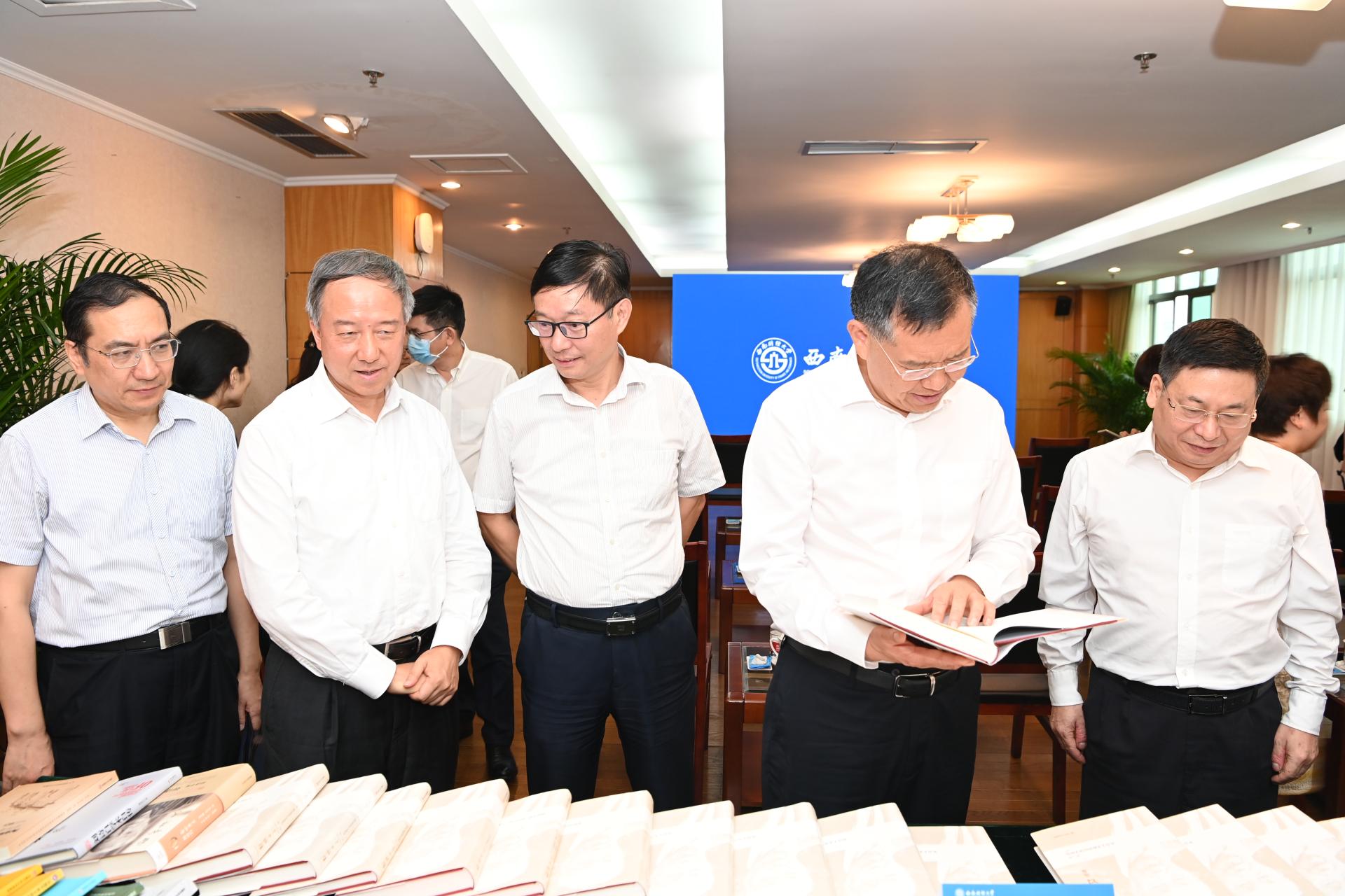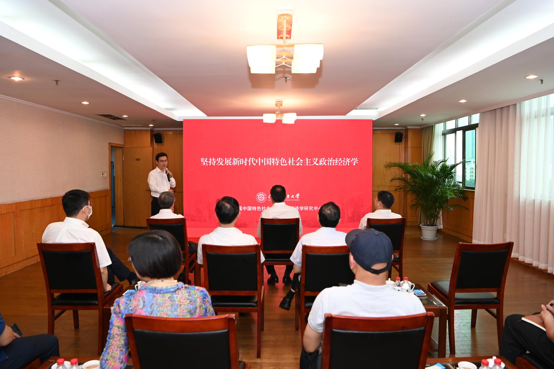 在光华楼601会议室,学校全国中国特色社会主义政治经济学研究中心负责人盖凯程教授以《坚持发展新时代中国特色社会主义政治经济学》为题,从“我校政治经济学学科优势长期积累的集中展现、中心学科发展规划、立足新发展阶段推动学科快速发展”三个方面汇报了近年来中心围绕“打造学术高地、筑牢思想阵地、建强育人基地”等方面的成效和特色成果。李建勤听取了情况汇报,与中心负责人进行了交流,询问了国内高校政治经济学发展建设等情况。随后,李建勤一行查看了成果展示,翻阅了中心布展的《刘诗白选集》以及政治经济学科研、教学和人才培养的标志性成果和建设情况。