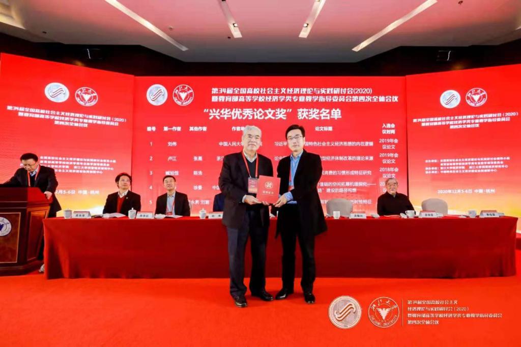 2020年12月5日上午,第 34 届全国高校社会主义经济理论与实践研讨会(2020)暨教育部高等学校经济学类专业教学指导委员会第四次全体会议在浙江大学隆重召开。本次研讨会中,中国人民大学刘伟《习近平新时代中国特色社会主义经济思想的内在逻辑》等5篇论文入选第五届"兴华优秀论文奖"。我院副院长、中特中心副主任盖凯程教授论文《“国进民进”中国所有制结构演进的历时性特征》名列其中,荣获“兴华优秀论文奖”。全国高校社会主义经济理论与实践研讨会领导小组组长、南京大学洪银兴教授为其颁奖。