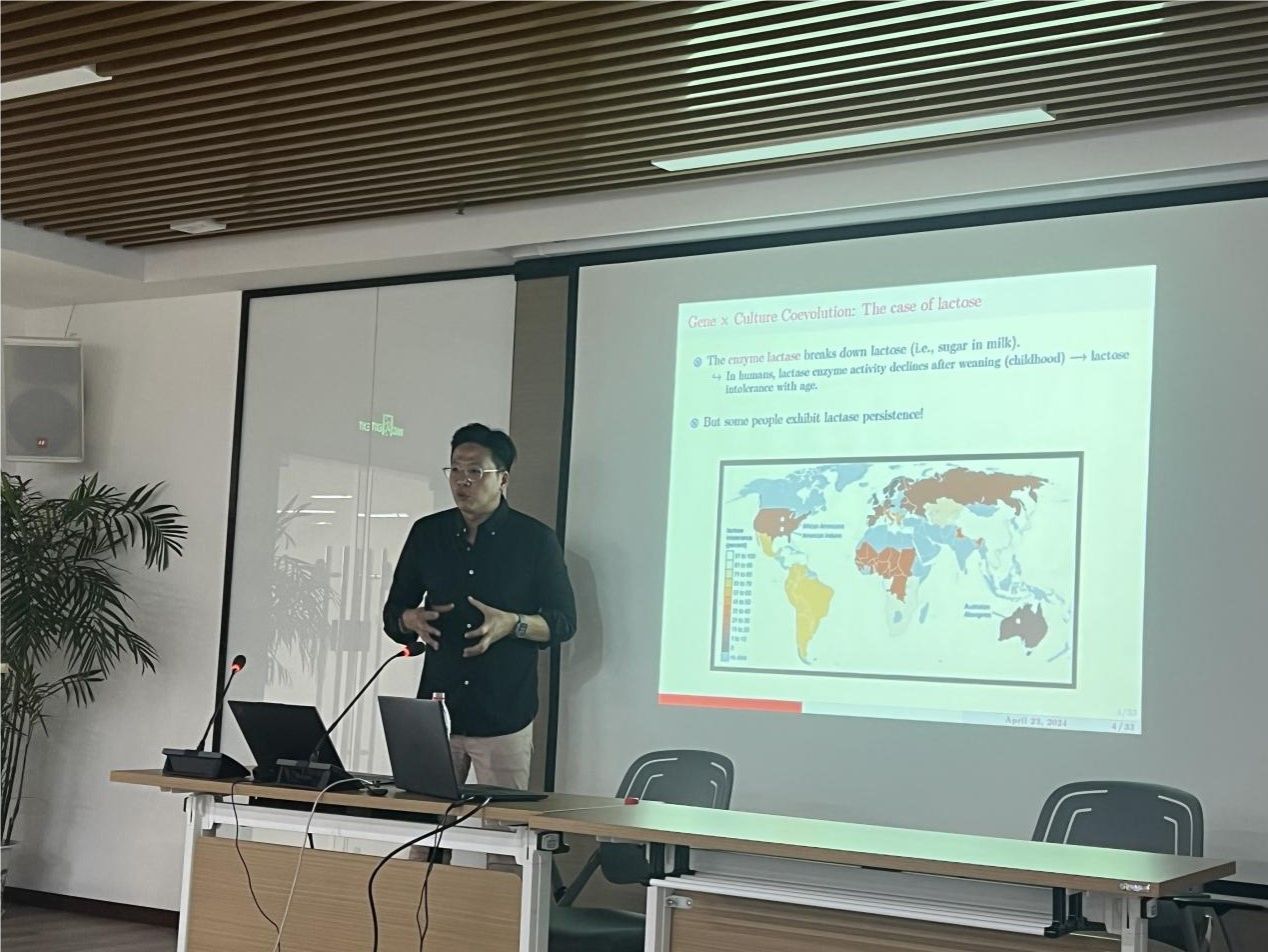 讲座伊始,CHEW Soohong教授宏观介绍了他们团队正在进行的研究:从基因视角,深入探讨了DRD4基因和水稻文化合作共同进化的理论。之后Lawrence CHOO、Richard EBSTEIN和LU Yunfeng分别详细介绍了自己在本课题中负责的内容。他们的研究首先以稻农的后代(RB)为样本,观察到合作性在公共物品博弈(PGG)中的表现。之后使用主成分分析法,发现RB与非RB受试者之间整体单核苷酸多态性(SNP)频率的差异。在Kitayama等人的研究基础上,他们将DRD4与合作性相关联,经过一系列大量严谨的实验,得出结论:DRD4与水稻种植区合作的基因X共同进化。他们后续的研究发现,在中国一万多年的水稻种植过程中,其他多巴胺能途径可以影响基因x培养的协同进化。