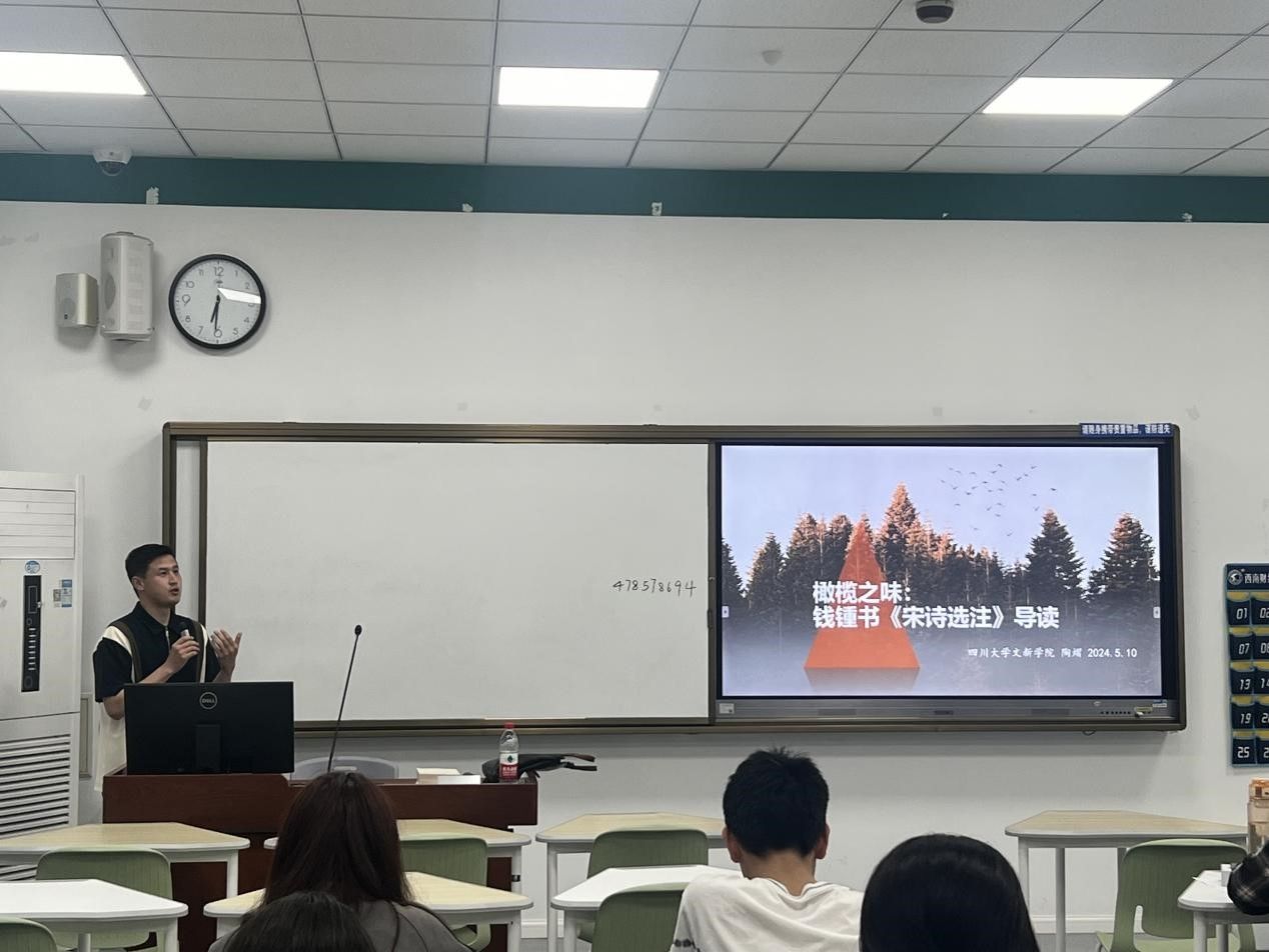 5月10日下午,光华讲坛6513期——“《宋诗选注》导读”学术讲座在经世楼203教室成功召开。本次讲座由四川大学陶熠副研究员主讲,对《宋诗选注》进行了深入的探讨,丰富了参会师生的文学素养。我院姚常成副教授主持了本次讲座。