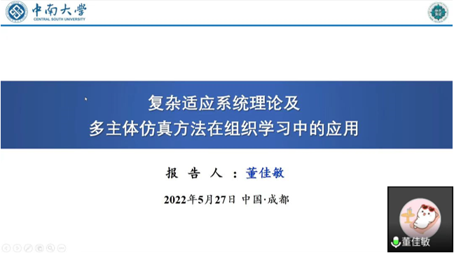 此次讲座邀请了中南大学商学院讲师董佳敏博士,作题为“复杂适应系统理论及多主体仿真方法在组织学习中的应用”的学术讲座。董老师主要研究方向为组织学习、领导力、组织韧性、群体智能、多主体仿真等,在Leadership quarterly、Journal of Industrial & Management Optimization、《管理评论》、《运筹与管理》等国内外期刊发表过多篇文章。本次讲座由张凯霞老师主持,共40余名师生参加了此次讲座。