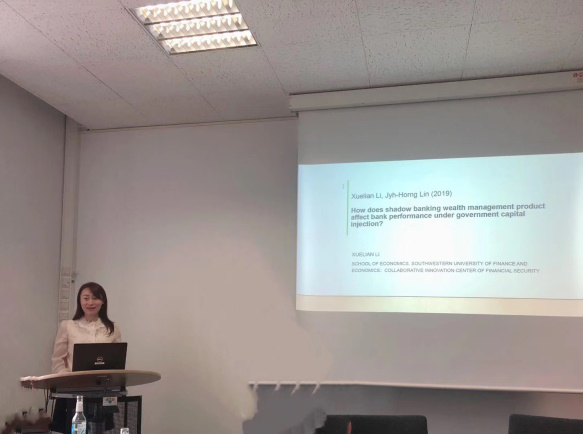 我院世界经济研究所李雪莲教授应邀参加了本次会议,并以Shadow banking efficiency and bank default risk under government capital injection为题发表了主题演讲。分析了影子银行理财产品在政府注资下对银行违约风险的影响,特别对2007年—2008年间的影子银行崩溃进行了深刻剖析与解读,引起在场嘉宾的共鸣与思考。
