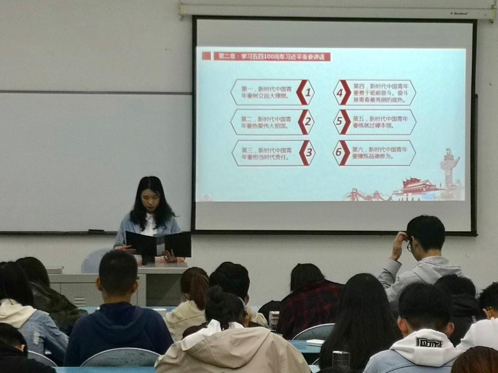 胡青晴同学分享了习近平总书记纪念五四100周年重要讲话的内容,习近平总书记在回顾五四历史后,强调了新时代新青年应具备的五四新精神。新时代中国青年要树立远大理想、热爱伟大祖国、担当时代责任;要勇于砥砺奋斗,奋斗是青春最亮丽的底色;要练就过硬本领、锤炼品德修为。她谈到作为青年学生骨干,应当严于律己,为其他青年做好表率;她鼓励大家要协调好学习和工作的关系,不断完善自我,有大局意识、担当意识,在实践中增长才干,锤炼品格。